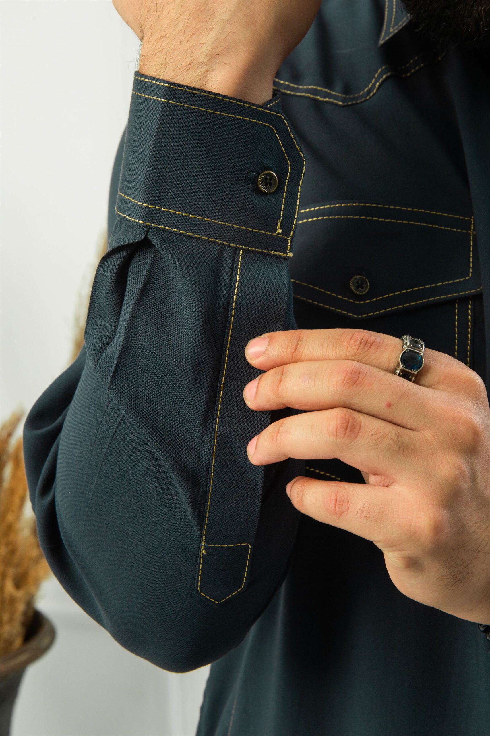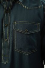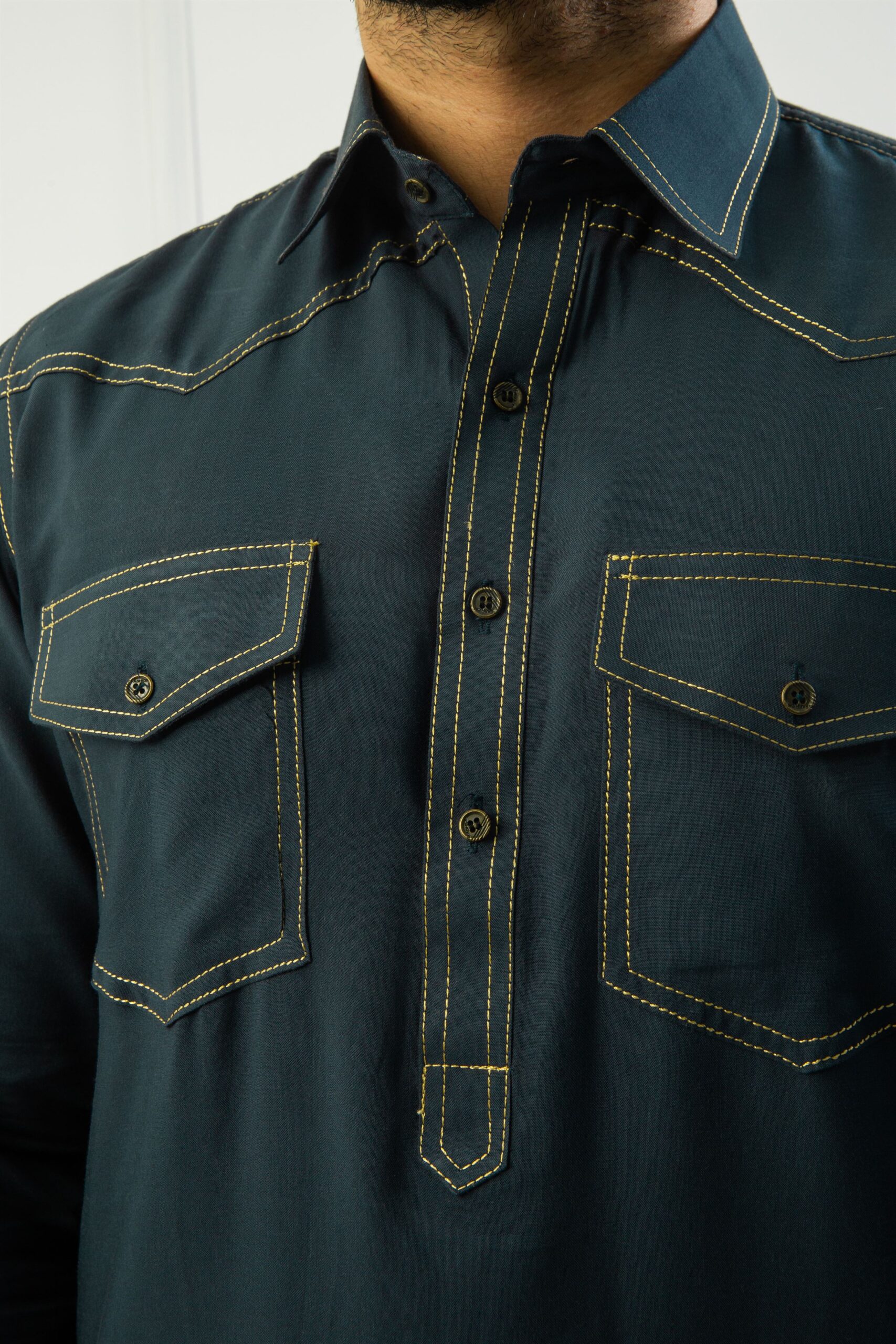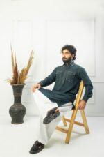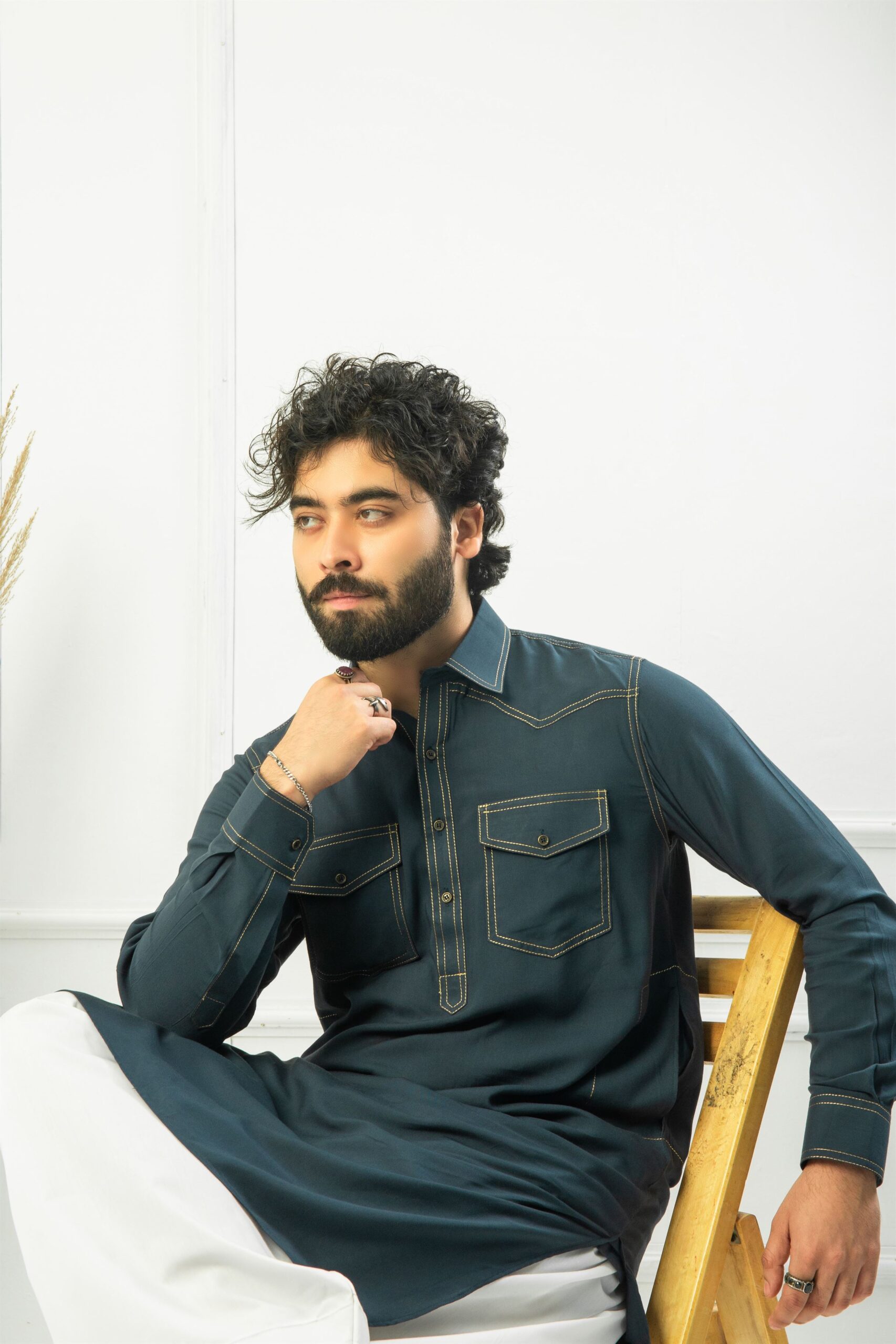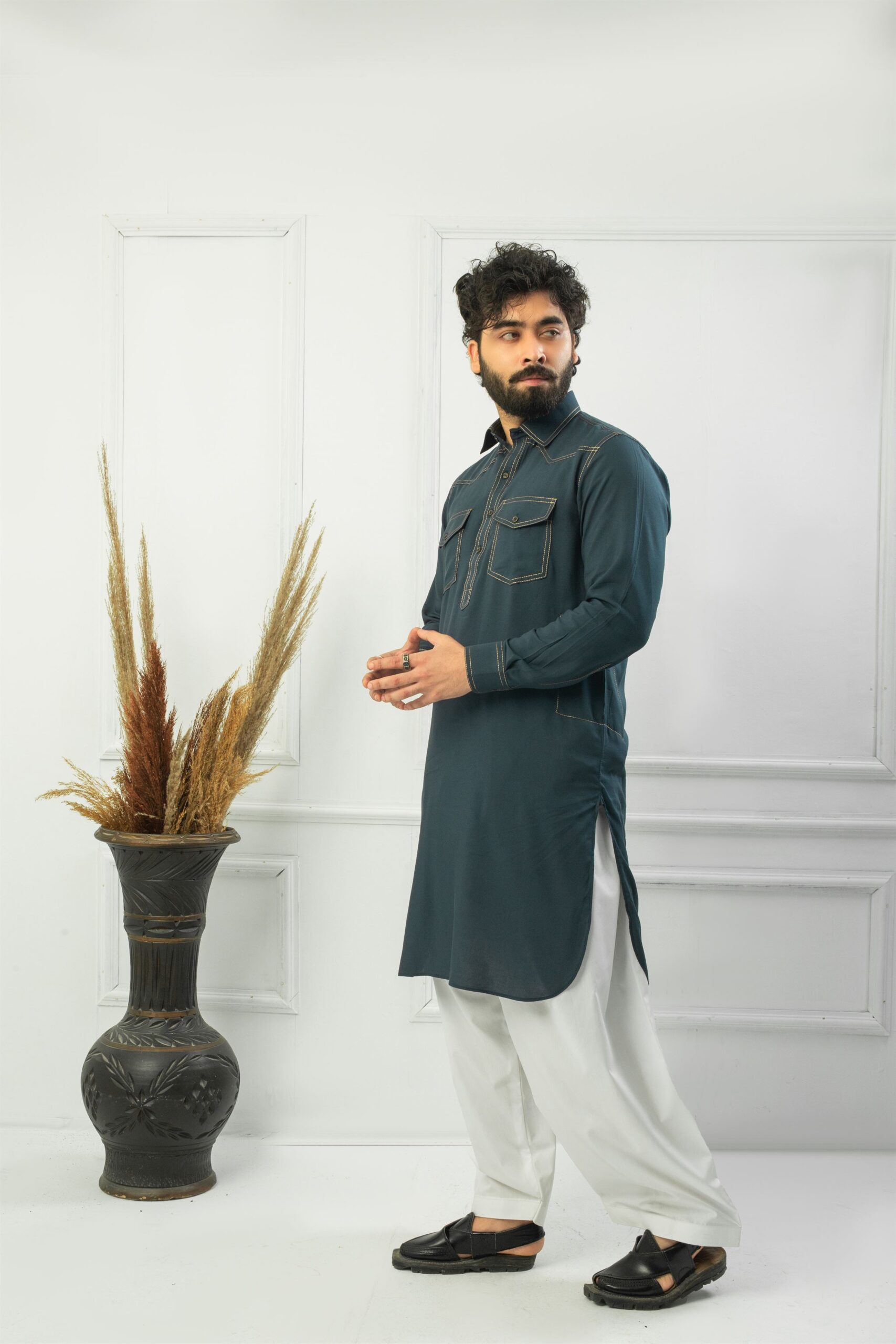 Redefine traditional attire with our deep olive green Kameez shalwar, a perfect balance of style and sophistication. Designed with precision, the kurta features a classic shirt collar, stylish buttoned placket, and intricate contrast stitching, adding an elegant touch to its contemporary silhouette. The double chest pockets with flaps and side slits enhance both functionality and comfort. Paired with a flowy white shalwar and black Peshawari chappals, our ensemble is a refined choice for festive occasions, cultural events, and traditional gatherings. Crafted with high-quality fabric, our outfit ensures both style and comfort, making it a wardrobe essential for every modern man.
